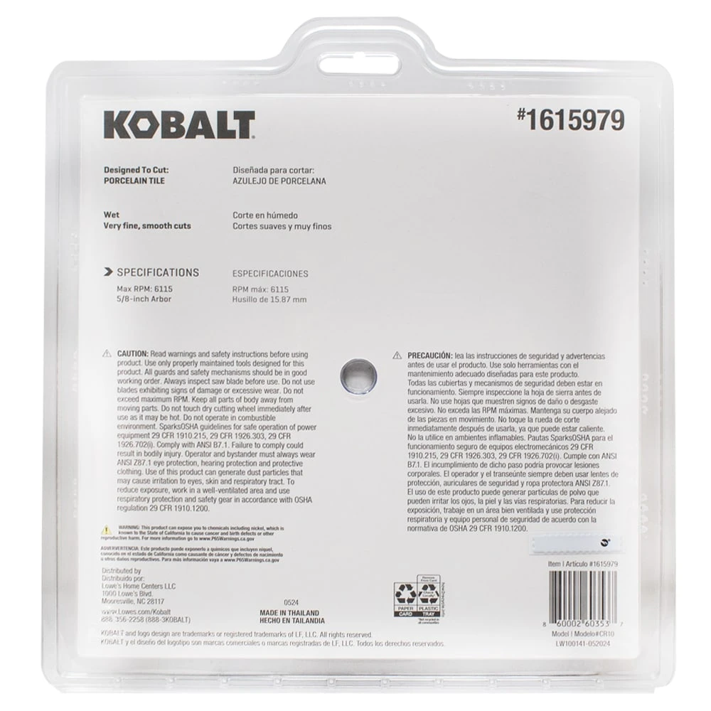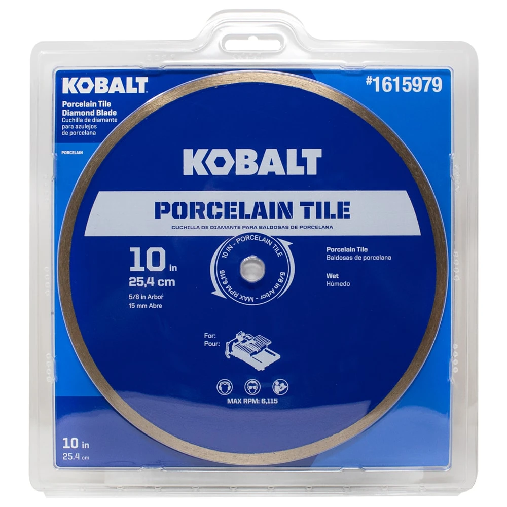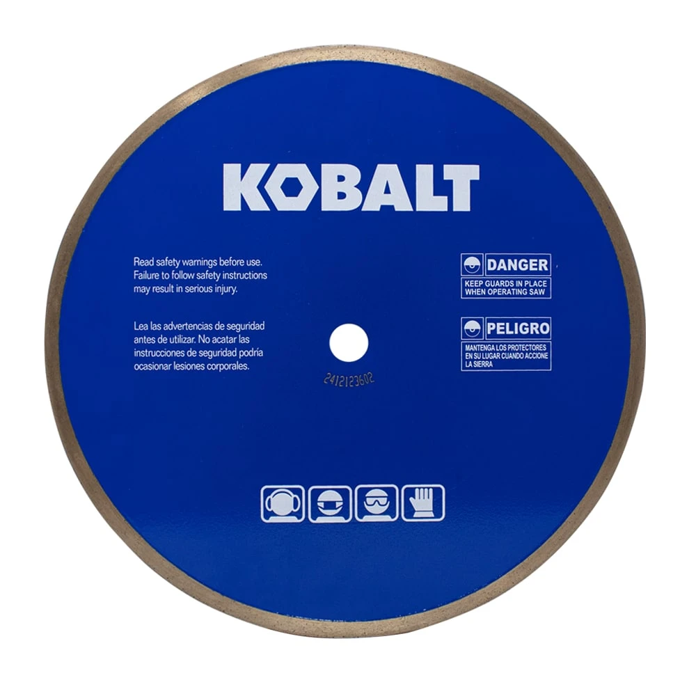 The Kobalt 10-in porcelain continuous rim diamond saw blade made for wet tile saws, delivers smooth and accurate cuts. Ideal for cutting porcelain, ceramic, marble and granite tile this durable blade is designed for fast cutting with a long-life span. This safe, wobble free blade makes it ideal for contractors and do it yourself consumers.