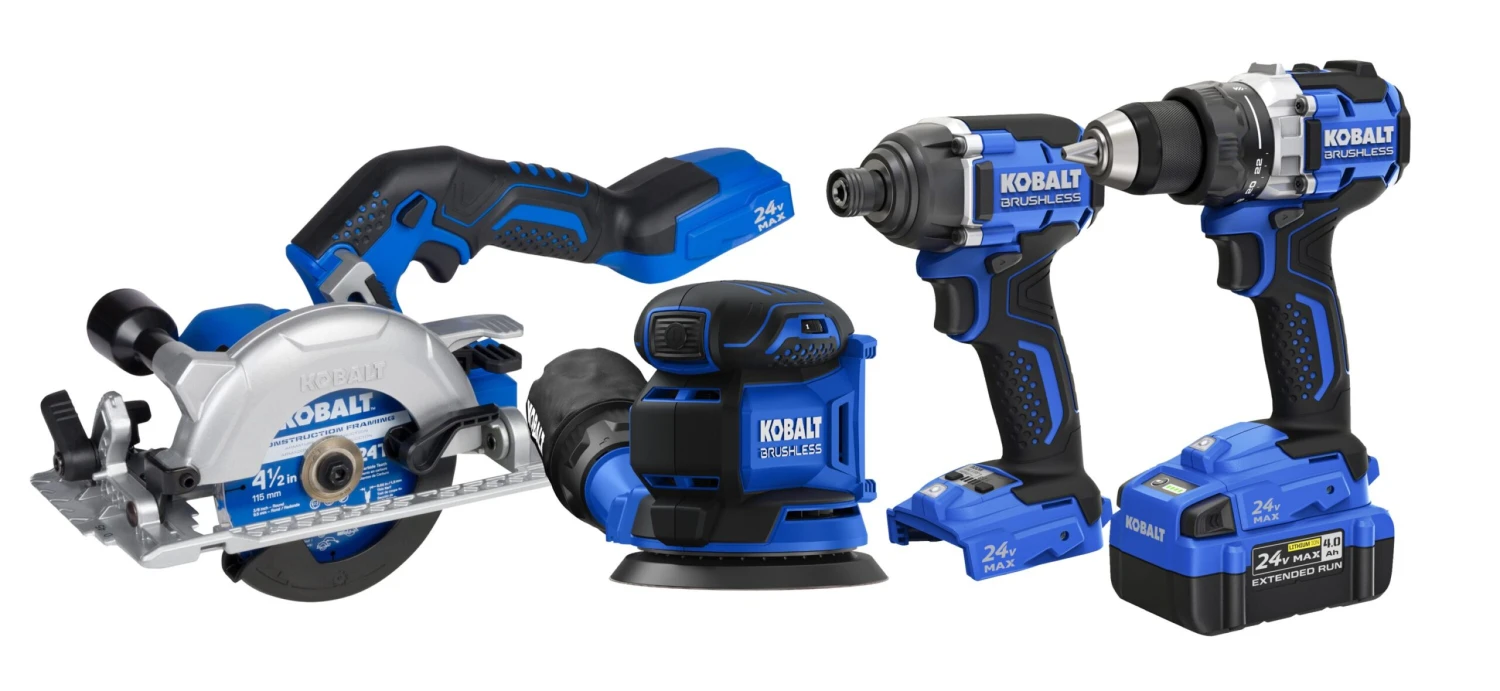 Kobalt 24-volt max cordless combo kit includes: 1/2-in drill/driver, 1/4-in impact driver, 5-in sander, 4-1/2-in circular saw, 24-volt 4.0Ah battery, 85W charger