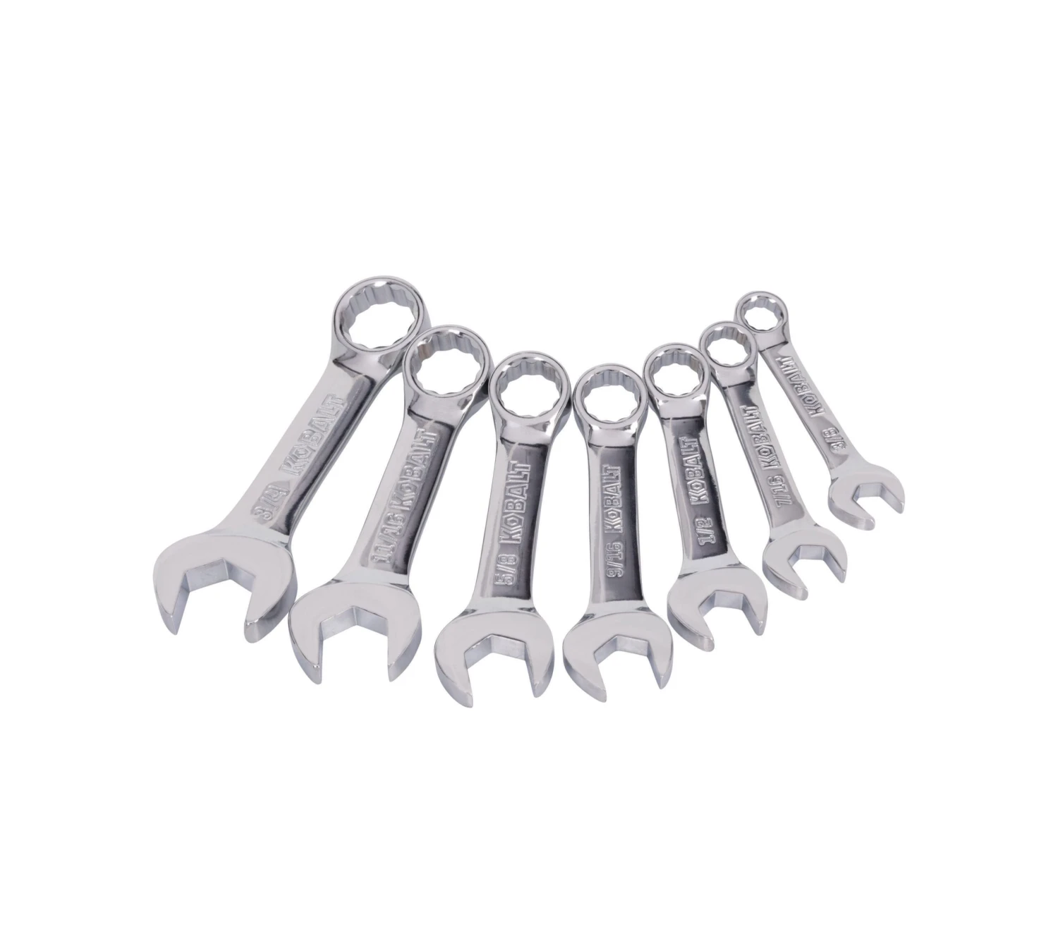 Kobalt’s standard (SAE) stubby combination wrench set includes 3/8, 7/16, 1/2, 9/16, 5/8, 11/16 and 3/4-inch wrenches