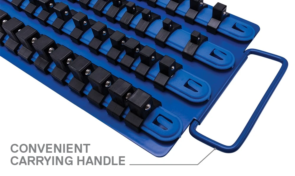 • Holds up to thirty (30) 1/4-inch, forty (40) 3/8-inch and sixteen (16) 1/2-inch drive standard (SAE) or metric sockets